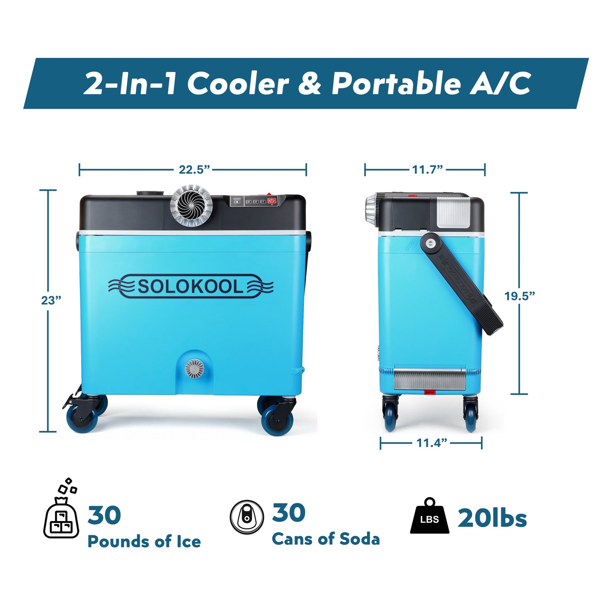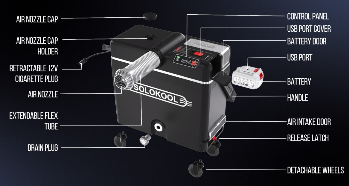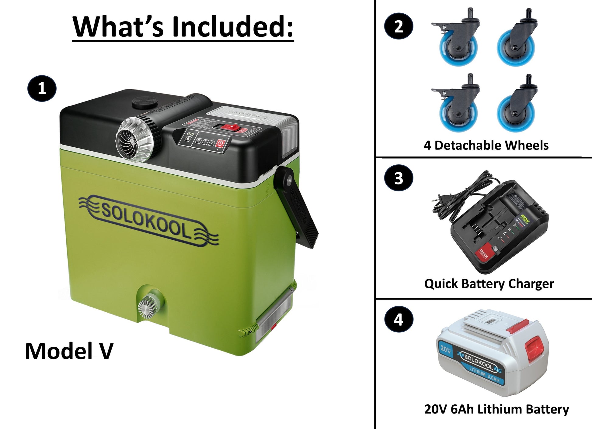 The SoloKool Model V is perfect for cooling yourself down outdoors and indoors. The state of the art 2-in-1 ultra-portable air conditioner that can also be used as a cooler for your ice and beverages. All you need is to put ice inside! The Model V runs on our proprietary 20V 6Ah lithium battery, providing long lasting relief from the summer heat wherever you go. With adjustable speed settings, the Model V can quickly produce cool, comfortable air when and where you need it most.
